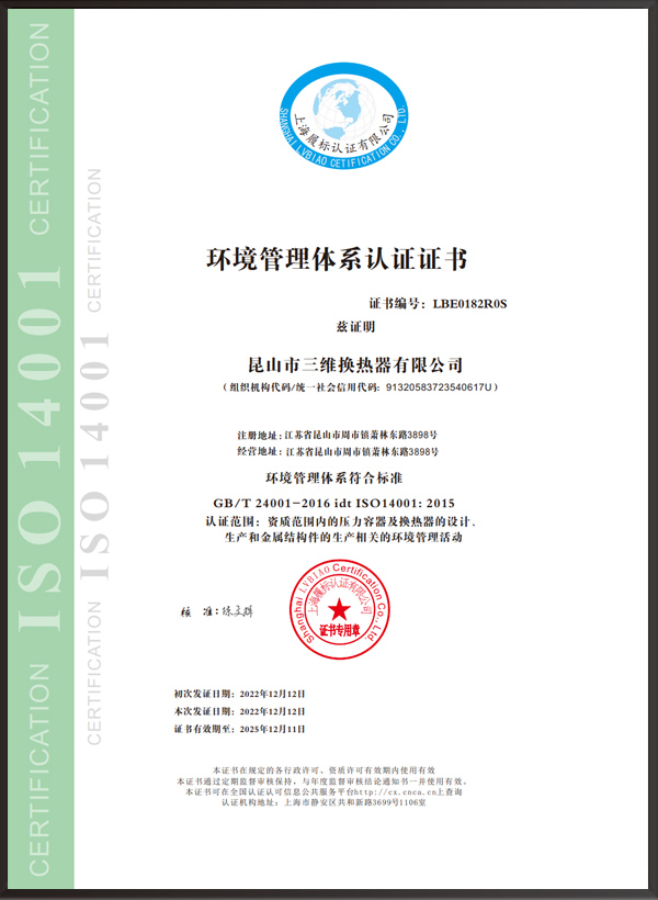 昆山市三維換熱器有限公司注冊資本5000萬元,資產2.1億元,公司地址位于江蘇省昆山市周市鎮蕭林東路3898號,法人代表為顧安生,公司設有技術部、生產部、檢驗部。